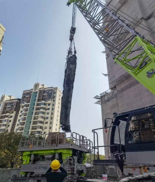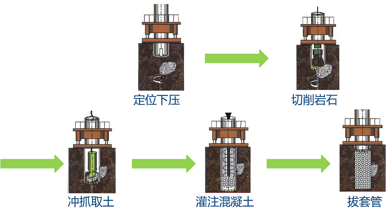 利用全套管全回轉(zhuǎn)鉆機的回轉(zhuǎn),使鋼套管與土層間的摩阻力大大減小,邊加轉(zhuǎn)邊壓入,同時利用沖抓斗、沖擊錘挖掘取土或旋挖取土,直至套管下到樁端持力層為止。挖掘完畢后,立即測量孔深確認持力層,滿足要求后進行清孔,安裝鋼筋籠,澆灌混凝土成樁完成。