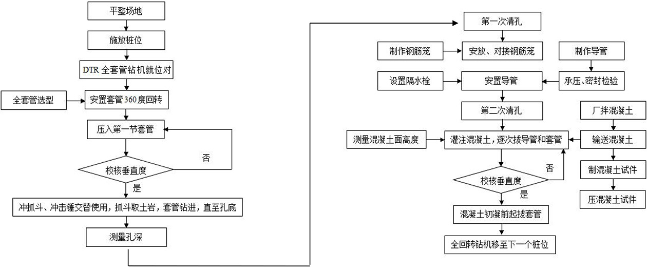 測量放線→設(shè)備就位→埋設(shè)套管→搓入套管→抓斗掏土→吊放鋼筋籠→灌注混凝土→起拔套管→設(shè)備就位下一根樁